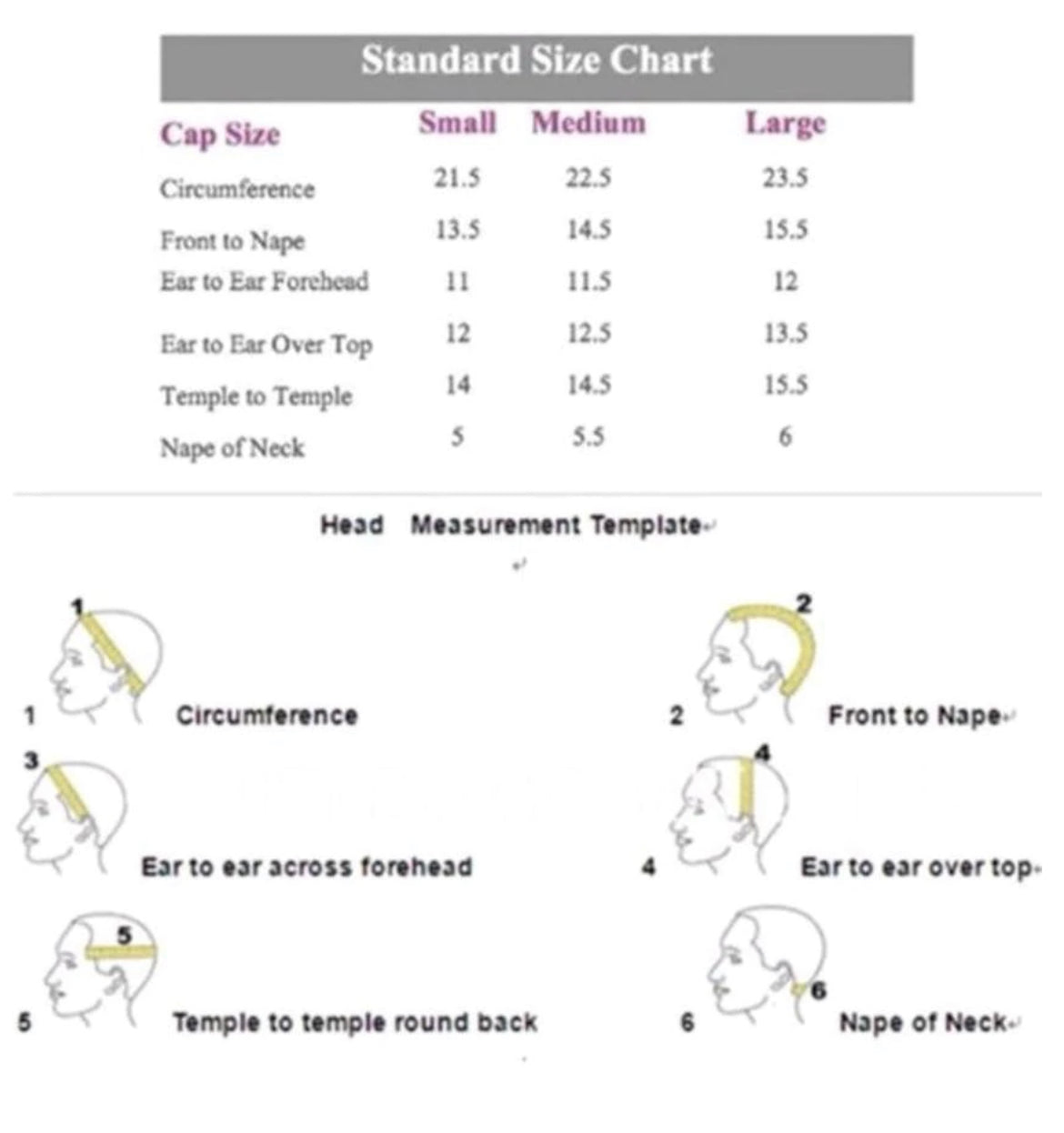 Please refer to the measurement chart in the next picture and provide accurate measurements. Incorrect measurements may result in a poorly fitting wig, and we cannot be held responsible for inaccuracies.